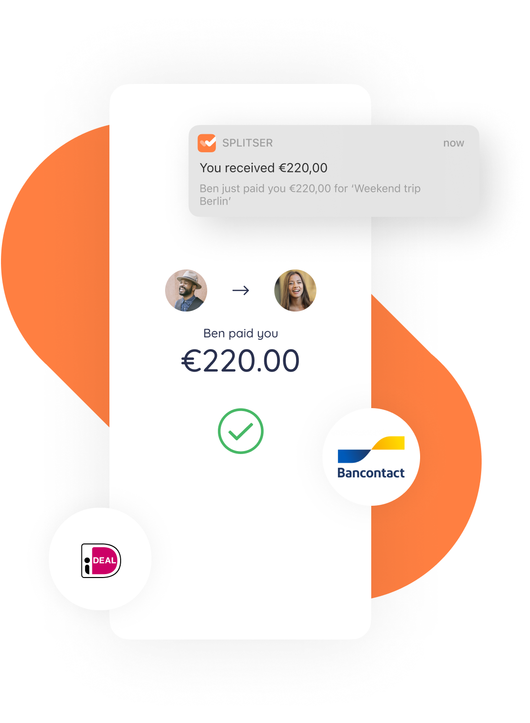Collega il tuo conto bancarioin modo che altri possano rimborsarti in modo semplice e veloce tramite iDEAL o Bancontact. Ricevi notifiche quando qualcuno ti ha rimborsato. Ricorda a coloro che devono ancora pagarti.
